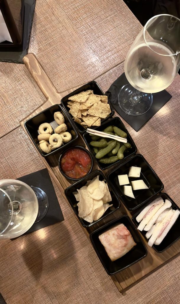 Cuando volvimos de nuestra ruta en tren del Bernina Express, queríamos tomar algo y decidimos entrar en Caffè Novecento. Al pedir las bebidas te ponen una tabla generosa de aperitivos cada dos personas y con la segunda bebida, un cuenco con patatas fritas de bolsa. Es un lugar donde se reúne la gente para charlar mientras te tomas algo, o si vas solo, a leer un libro porque también tiene una estantería llena de libros.
