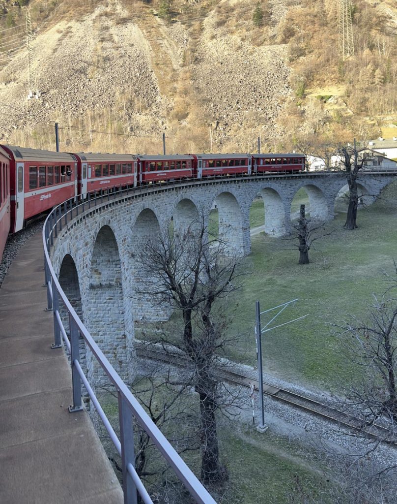 Existen dos trenes para hacer esta ruta, el Bernina Express (tren panorámico) y el tren regional. El trayecto es exactamente el mismo, el tren, ya sea el panorámico o el regional, pasan por la misma vía.