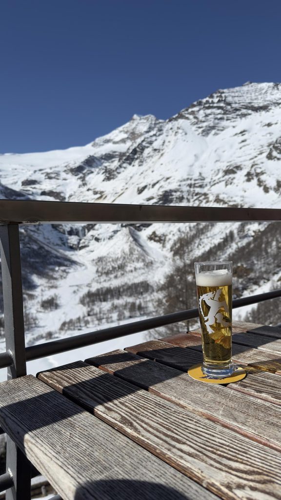 La siguiente parada sí que no te la puedes perder, se llama Alp Grüm. Tiene mirador y el paisaje es precioso. Aquí nos tomamos unas cervezas y unos refrescos por 4€/ud en la terraza mirador del bar. Fueron unos minutos maravillosos.
