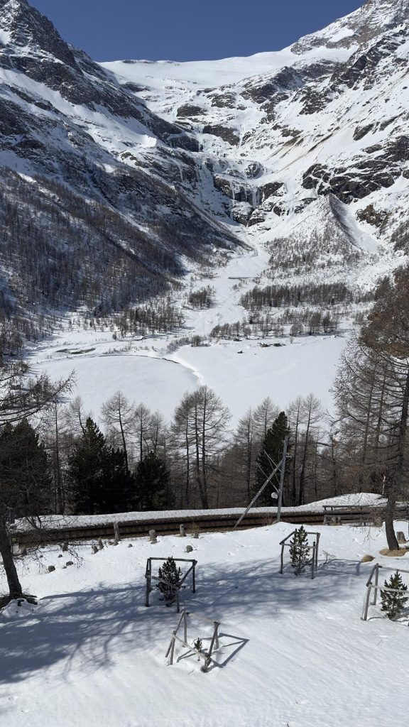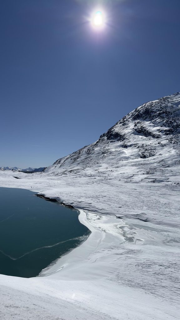 Llegamos a St. Moritz y nos encontramos el lago helado. En invierno hacen eventos de lujo y carreras de caballo sobre el lago helado. Es uno de los lugares más exclusivos del mundo, parece un escenario de película.