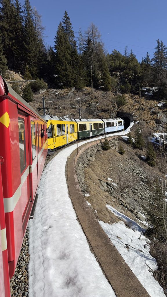 Nosotros hicimos Tirano – St. Moritz saliendo por la mañana temprano y a las 15.50 horas, volvimos de St. Moritz a Tirano. Íbamos con dos niños de 5 y 10 años y ellos no sólo no se aburrieron, sino que lo disfrutaron mucho. Digamos que pasamos todo el día en el tren y fue una gran experiencia para todos.
