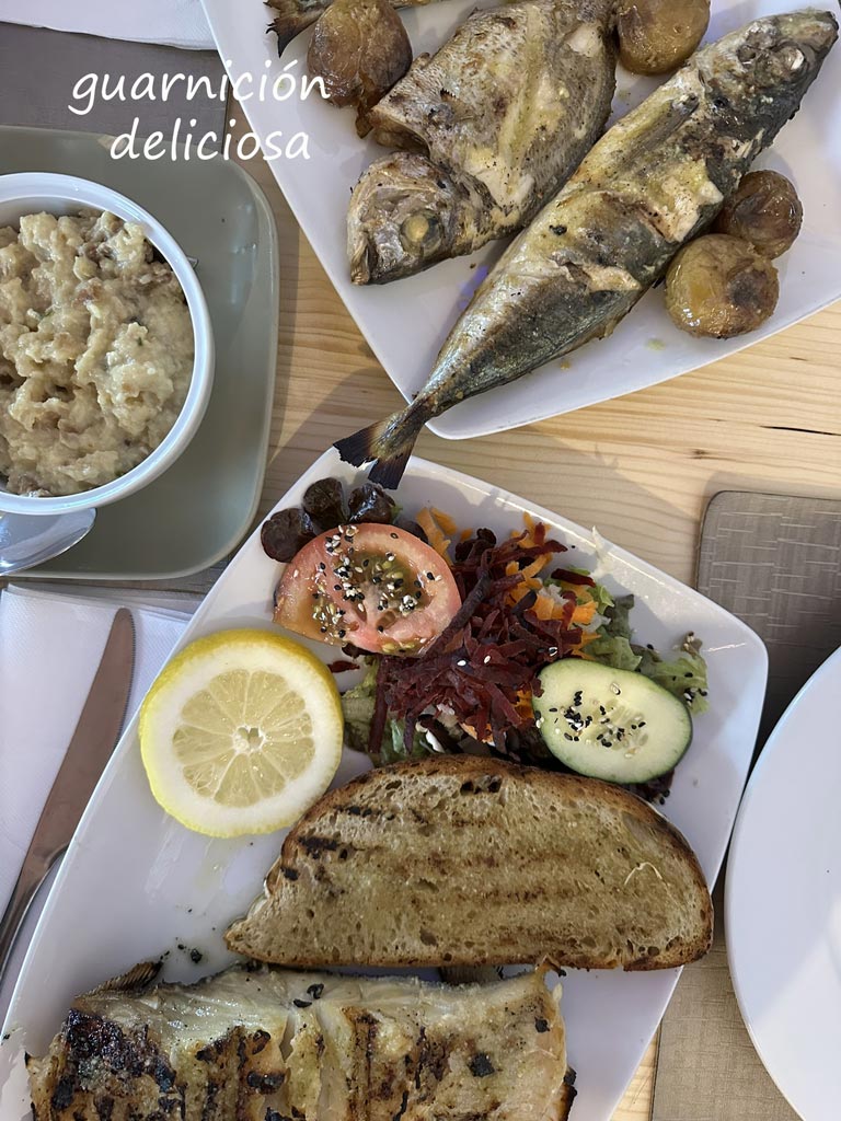 En este restaurante comimos un pescado a la brasa riquísimo, lo acompañaban con distintas guarniciones pero en concreto, una de ellas estaba elaborada con pan y huevos revueltos que estaba realmente deliciosa.