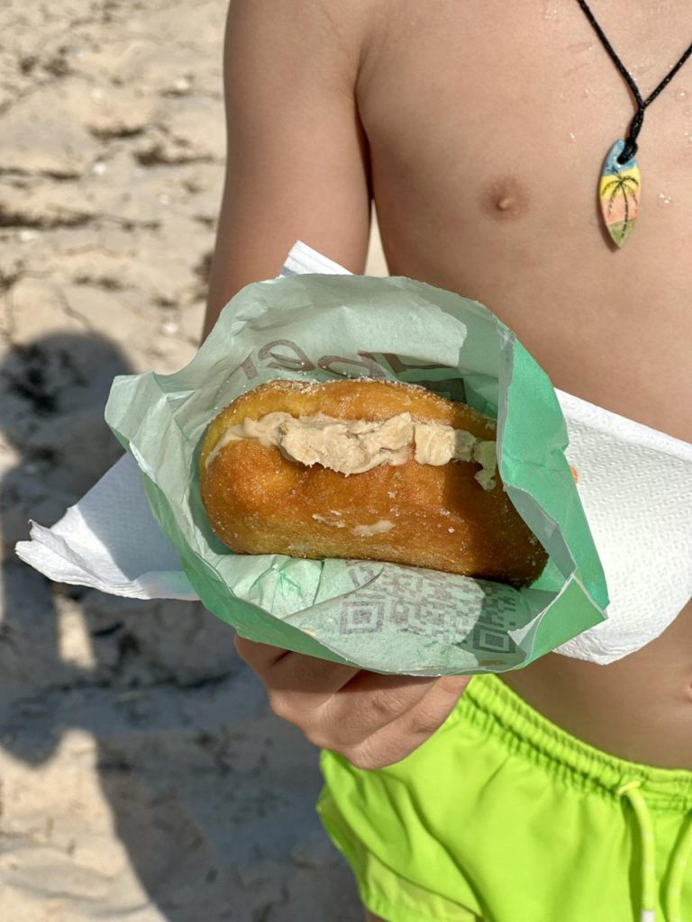 Mientras estás en la playa, encuentras a vendedores ofreciendo bolinhas (es una masa de brioche frita envuelta en azúcar y rellena con crema pastelera por 2€).